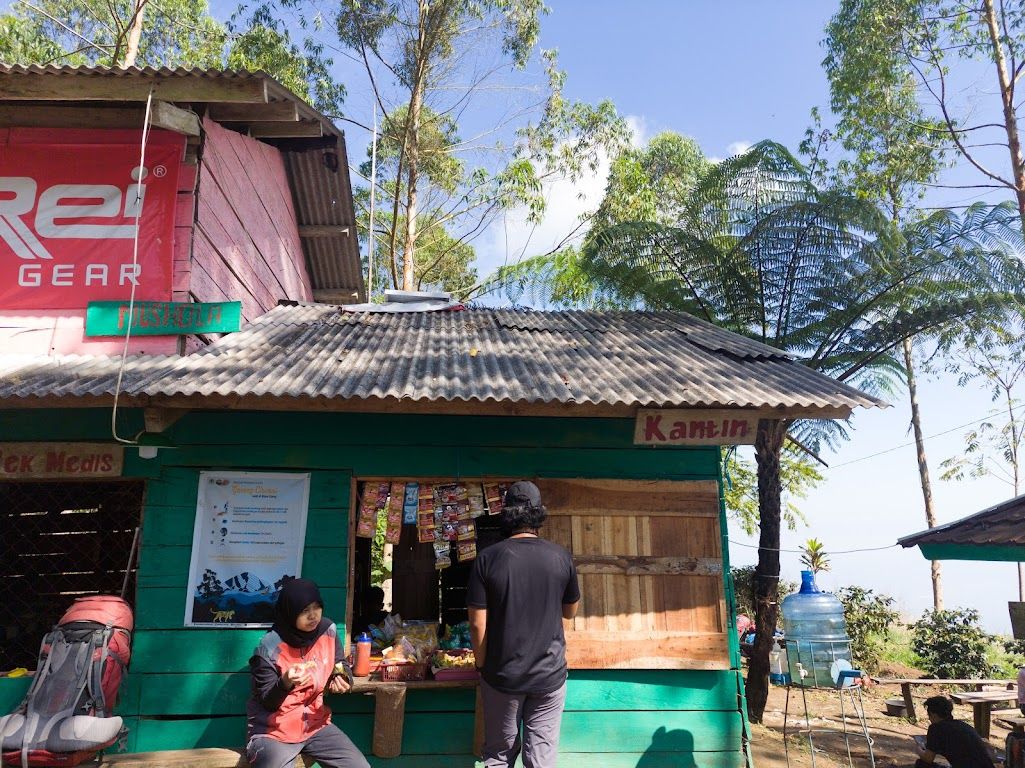Setelah kurang lebih 50 menit, kami tiba di basecamp. Di sini terdapat 1 warung yang menjual minuman, makanan ringan, mi, dan tentunya gorengan. Sayangnya tidak ada buah seperti warung-warung di pos pendakian Gunung Slamet, hahahaha. Di basecamp ini juga tersedia toilet, jadi yang masih punya urusan pencernaan, bisa diselesaikan sebelum pendakian dimulai.
