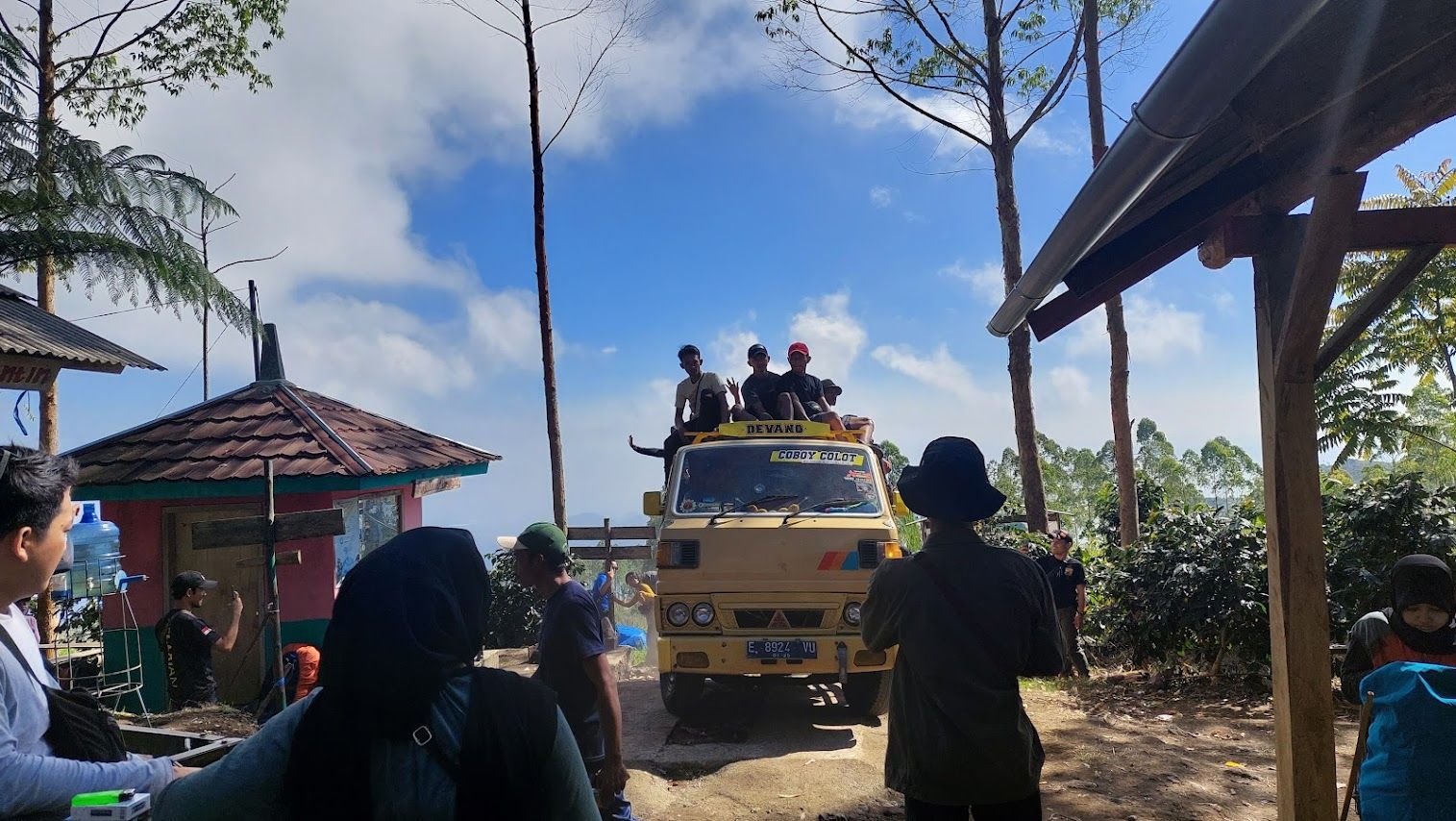 Dari pos pendaftaran, kami melanjutkan perjalanan menuju basecamp Trisakti Sadarehe dengan naik mobil pick up. Sebagian dari rombongan kami ada juga yang naik truk. Jalur yang dilewati cukup cukup membuat mual, namun pemandangan indah Ciremai dari kejauhan sudah memanggil, dan membuat rasa mual tadi berkurang.