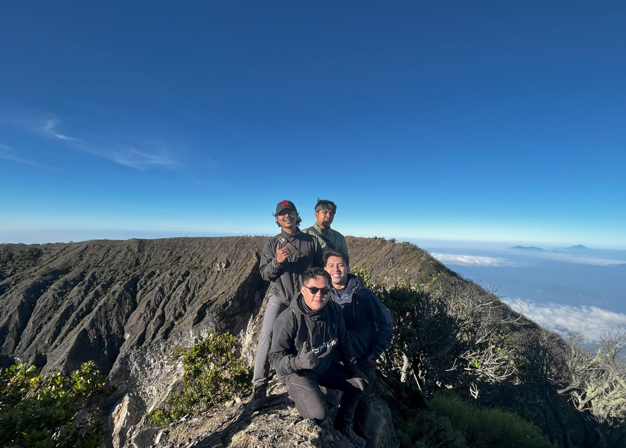 Kami tiba di puncak sekitar pukul 6.30. Langit sudah mulai berubah menjadi biru, namun tetap tak kalah indah. Dari sini, pendaki bisa langsung melihat kawah gunung. Serta di kejauhan, tampak para pendaki yang sedang berfoto di puncak Ciremai via Apuy.